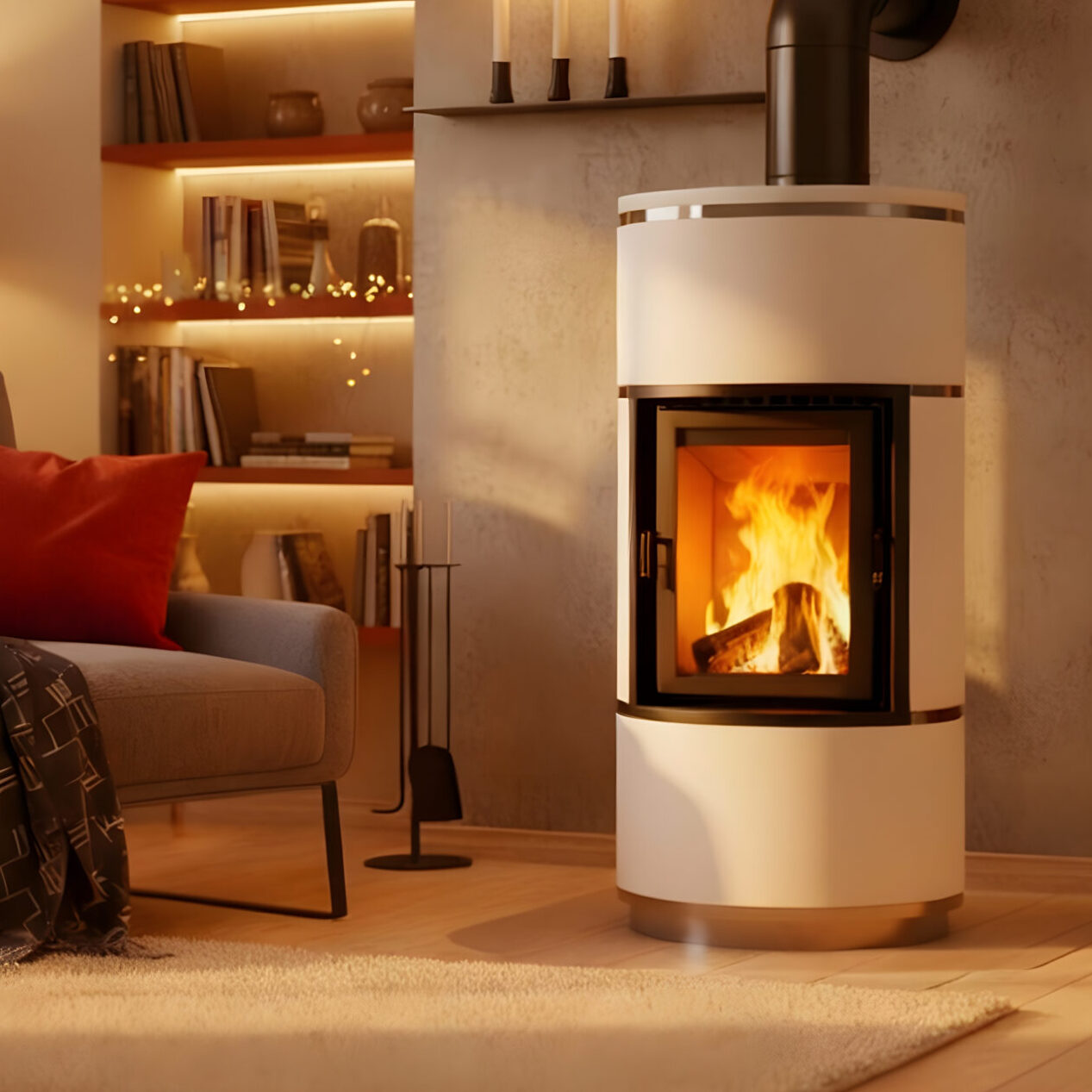 • Hengeres design: A kerek forma lágyítja a teret és lehetővé teszi a kandalló sarokba vagy fal mellé történő elhelyezését is.